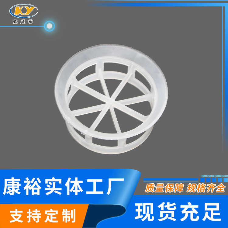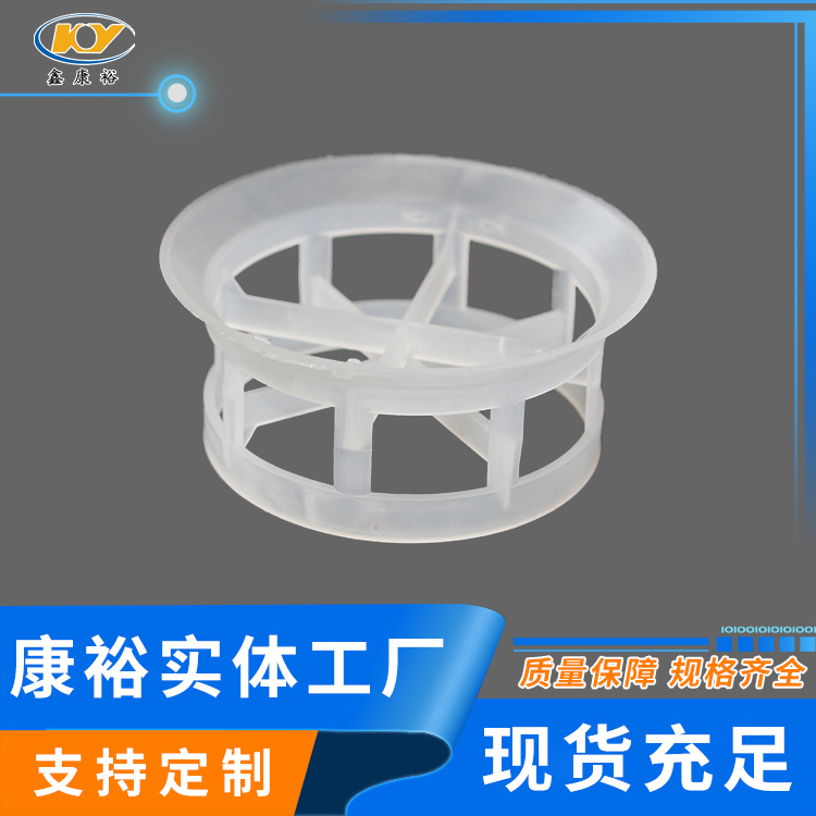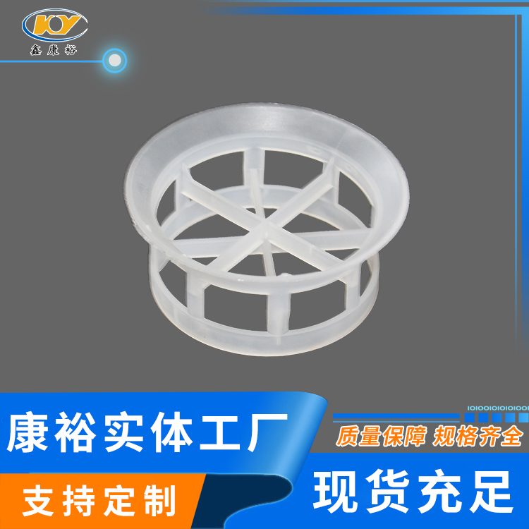 由于階梯環(huán)填料的側(cè)端增加了翻邊,不但可以增加填料環(huán)的機(jī)械強(qiáng)度,而且由于破壞了填料結(jié)構(gòu)的對(duì)稱性,因而增加了填料投放時(shí)的定向幾率。又由于翻邊的影響,使得填料在堆積時(shí)填料環(huán)隙之間的接觸由此線性接觸為主變?yōu)橐渣c(diǎn)接觸為主。這樣,不但增加了填料顆粒之間的空隙,減少了氣體穿過(guò)填料層的阻力,而且這些接觸點(diǎn)還可以為液體沿填料表面流動(dòng)的匯聚分散點(diǎn),從而加進(jìn)了液膜的表面更新,有利于填料傳質(zhì)效率的增強(qiáng)。