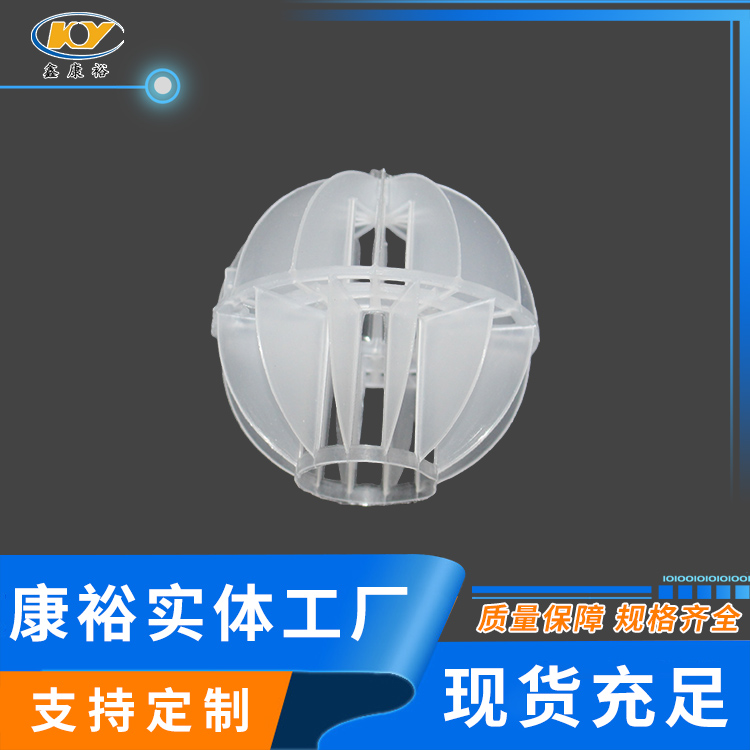 塑料多面空心球填料是水處理項目和廢氣處理常用到的一種填料,也是現(xiàn)在環(huán)保裝置項目常見的一種填料,大多采用聚丙烯(PP)塑料制成。多面空心球填料,在球中部沿整個周長有一道加固環(huán),環(huán)的上下各有十二片球瓣,上下球瓣互相交錯,沿中心軸呈放射形布置。多面空心球填料具有表面積大,傳質效率高,產品的球瓣與球瓣之間空間大,且重量輕、強度大、安裝方便、葉片多,阻力小,耐高溫,耐腐蝕,性能穩(wěn)定,適用于中間水箱,二氧化碳脫氧塔,接觸反應塔等裝置。在全國電力、化學、化纖、電子、造紙、化肥生產、河水淡化,環(huán)保、三廢處理等行業(yè)的水處理、脫碳、脫氣、凈化、脫碳酸及油水分離等處理裝置中廣泛使用。